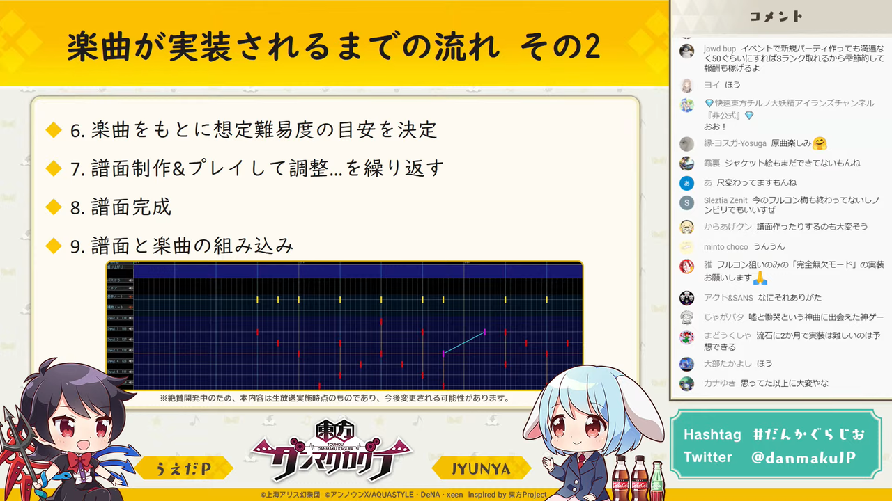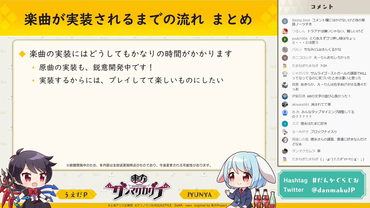 「東方ダンマク祭 ダンカグリリース当日SP」にて開催された原曲実装ドラフト会議で実装が決定した原曲3曲も、現在実装に向けて鋭意開発中とのことです。
