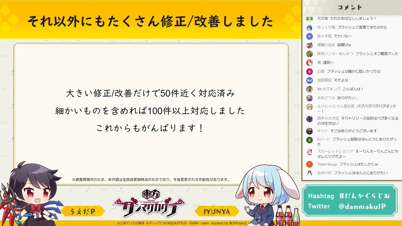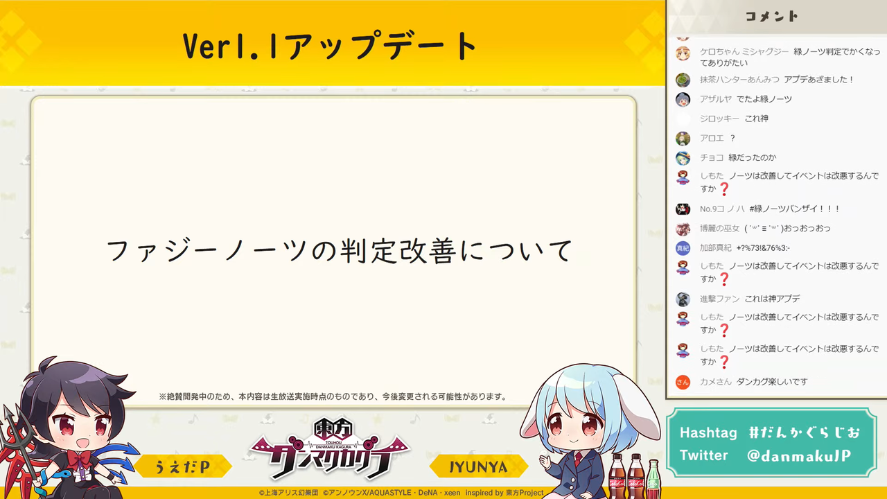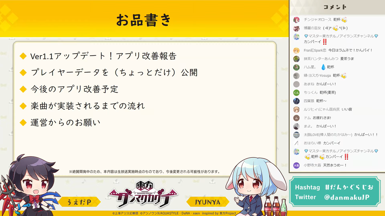 リリース前から引き続き団長のJYUNYAさんと副長のうえだPさんが出演し、アプリの改善報告や遊ばれた楽曲のランキング、新曲が実装されるまでの流れなど、リリース後らしくゲーム自体にまつわる数多くの内容を取り扱いました。
