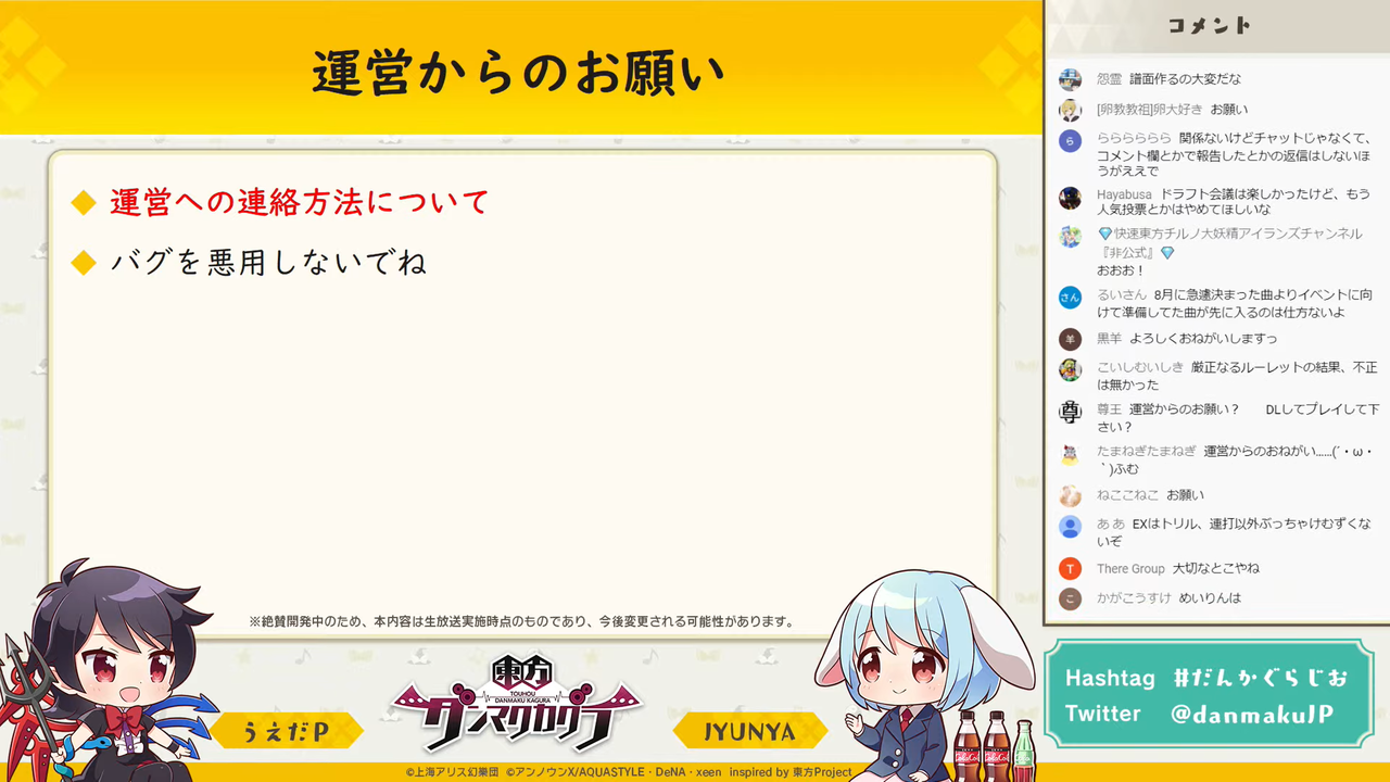 こちらの生放送では「東方ダンマク祭」恒例の生ライブのほか、「東方ダンマクカグラ」の最新情報も公開されるとのことなので必ず視聴したいですね。