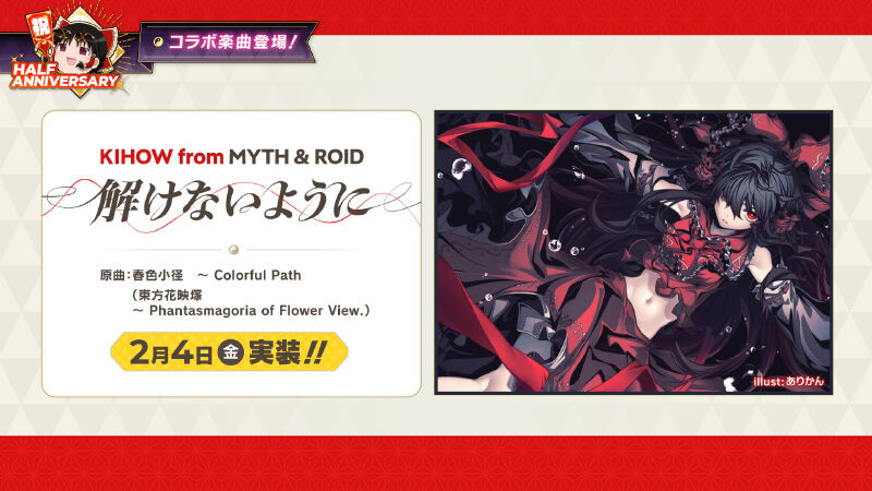 KIHOW from MYTH & ROIDさんとのコラボ楽曲となる書き下ろしアレンジ楽曲の「解けないように」も2月4日のハーフアニバーサリー記念日当日に実装が予定されています。