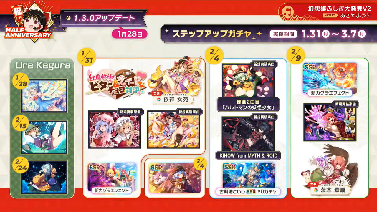 1月31日にはイベント「紅魔姉妹のビター&スイートなチョコ対決」に合わせてアレンジ楽曲の「悪戯センセーション」と「ファビュラス」が、2月4日のハーフアニバーサリー記念日当日は前述したように原曲の「ハルトマンの妖怪少女」と書き下ろしアレンジ曲の「解けないように」、2月9日にはアレンジ楽曲の「キング・オブ・ザ・説教」の実装が予定されています。