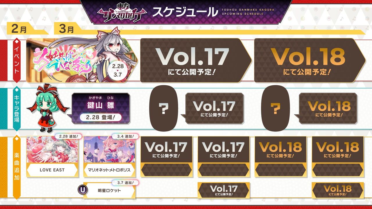 2022年2月27日、「ダンカグ通信」Vol.16にて、「東方ダンマクカグラ」に鍵山雛がヒロインとして実装されることやアレンジ楽曲の「LOVE EAST」や「マリオネットメトロポリス」が実装されることなど多数の新情報が発表されました。