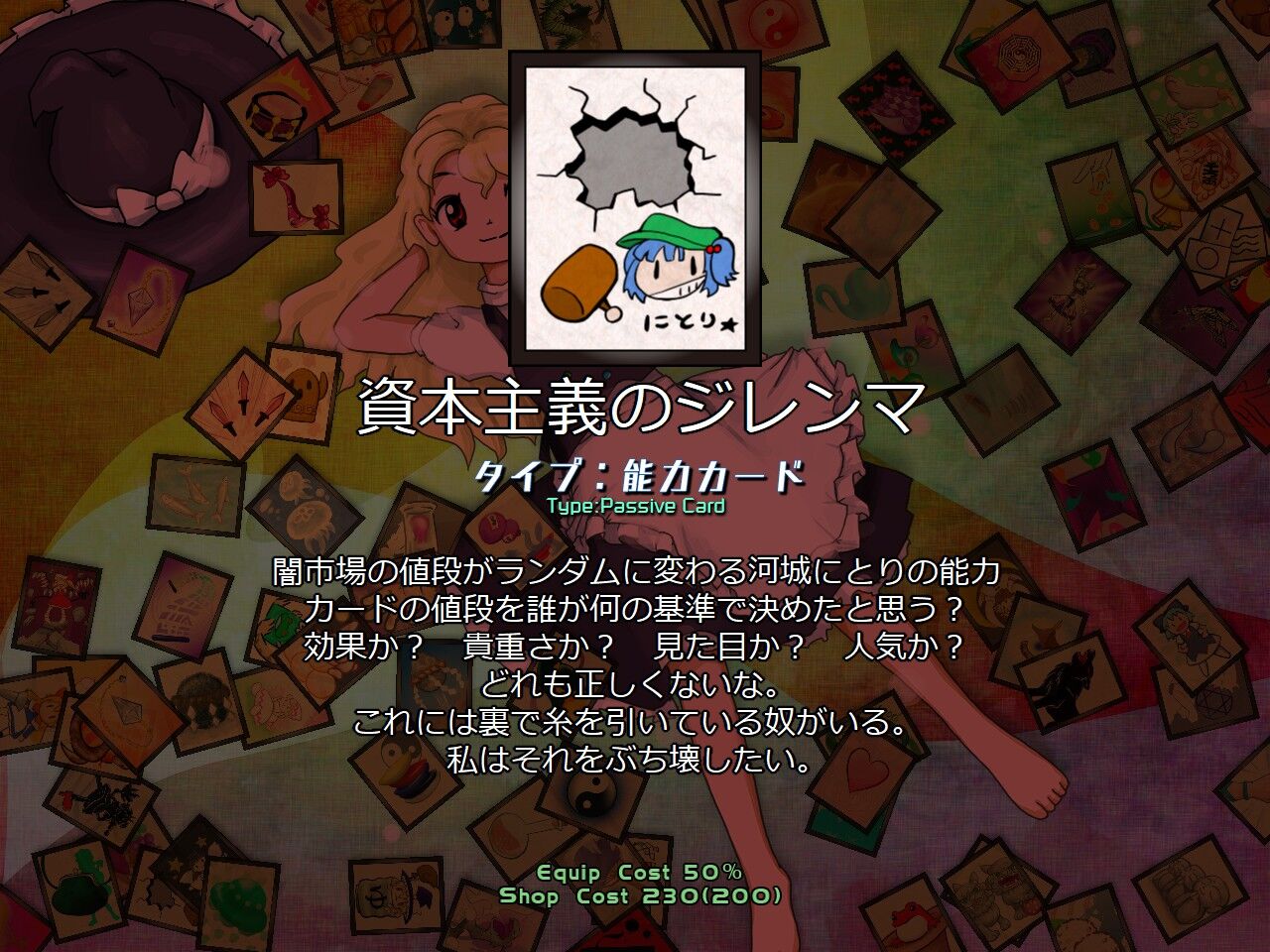 にとりが用意していた秘策とは、「資本主義のジレンマ」という闇市場の値段がランダムに変わってしまう、とても恐ろしい能力を持ったアビリティカードでした。