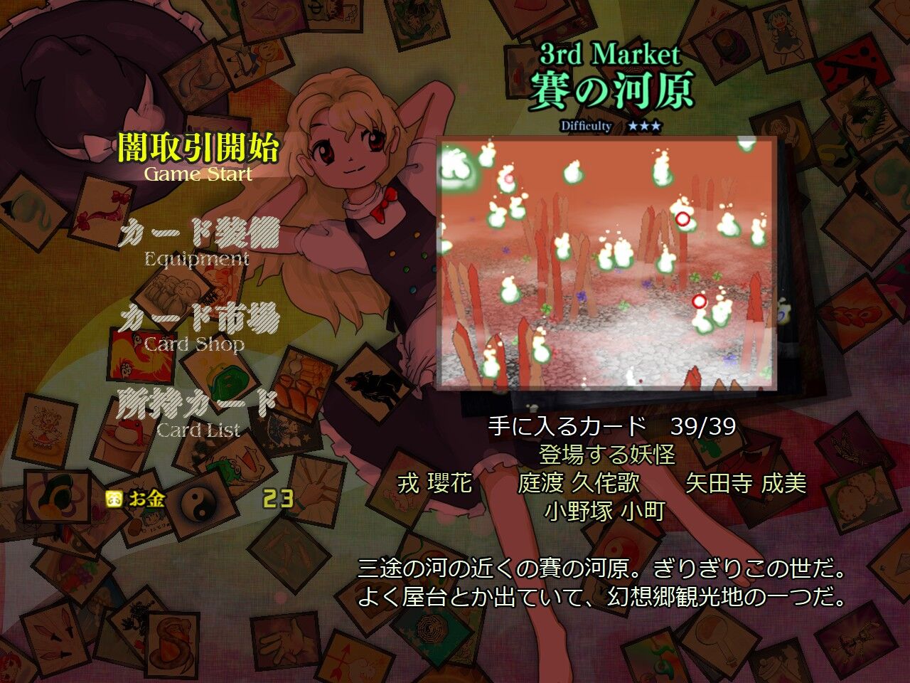 弾貨は闇市場とともに幻想郷の各地へ広まっており、守矢神社ではカードの闇取引が行われる闇縁日まで開かれていました。