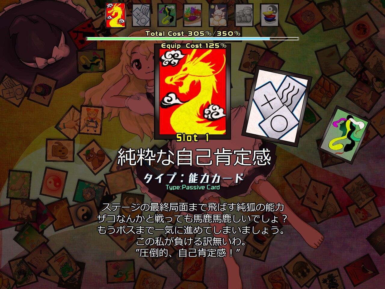「東方虹龍洞」と比べてカードの枚数が約1.5倍以上に増えたことだけでなく、初期装備コストの設定や全体的な装備できるカード枚数の増加、ステージで稼いだお金の持ち越しなど、各種のシステムが洗礼された感が強く、アビリティカードを活用するゲームとしては完成形と言っても過言ではないかもしれません。