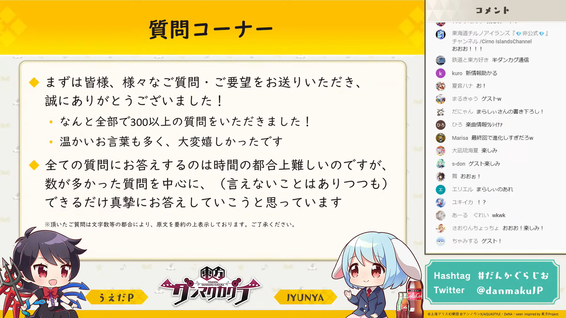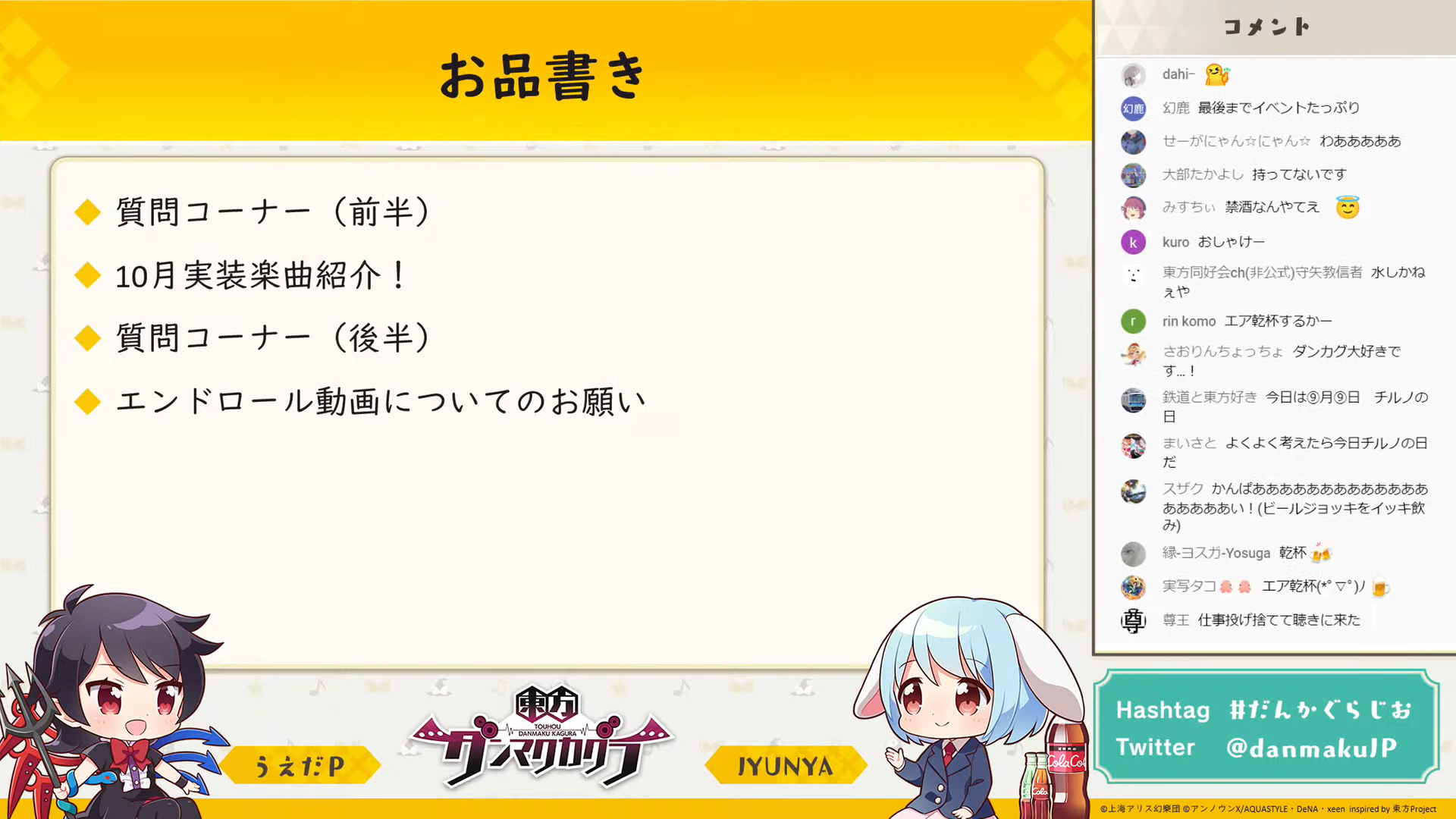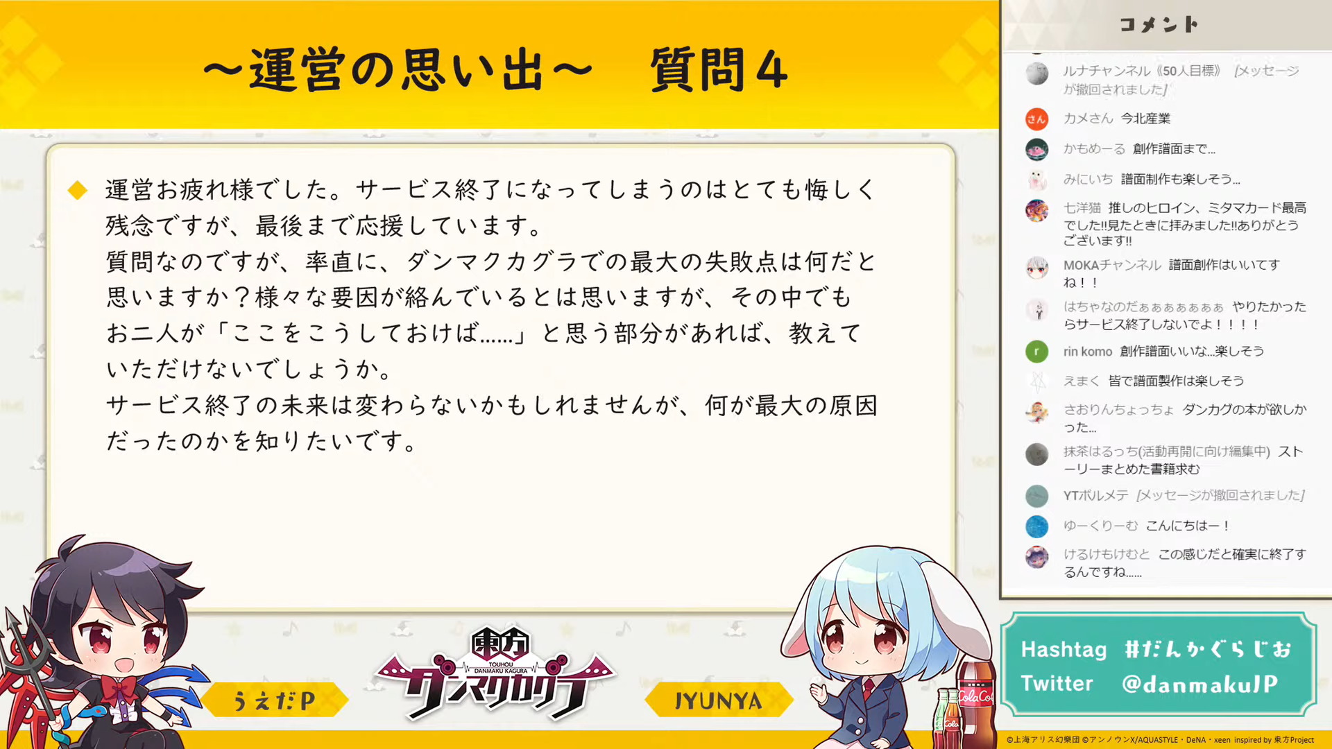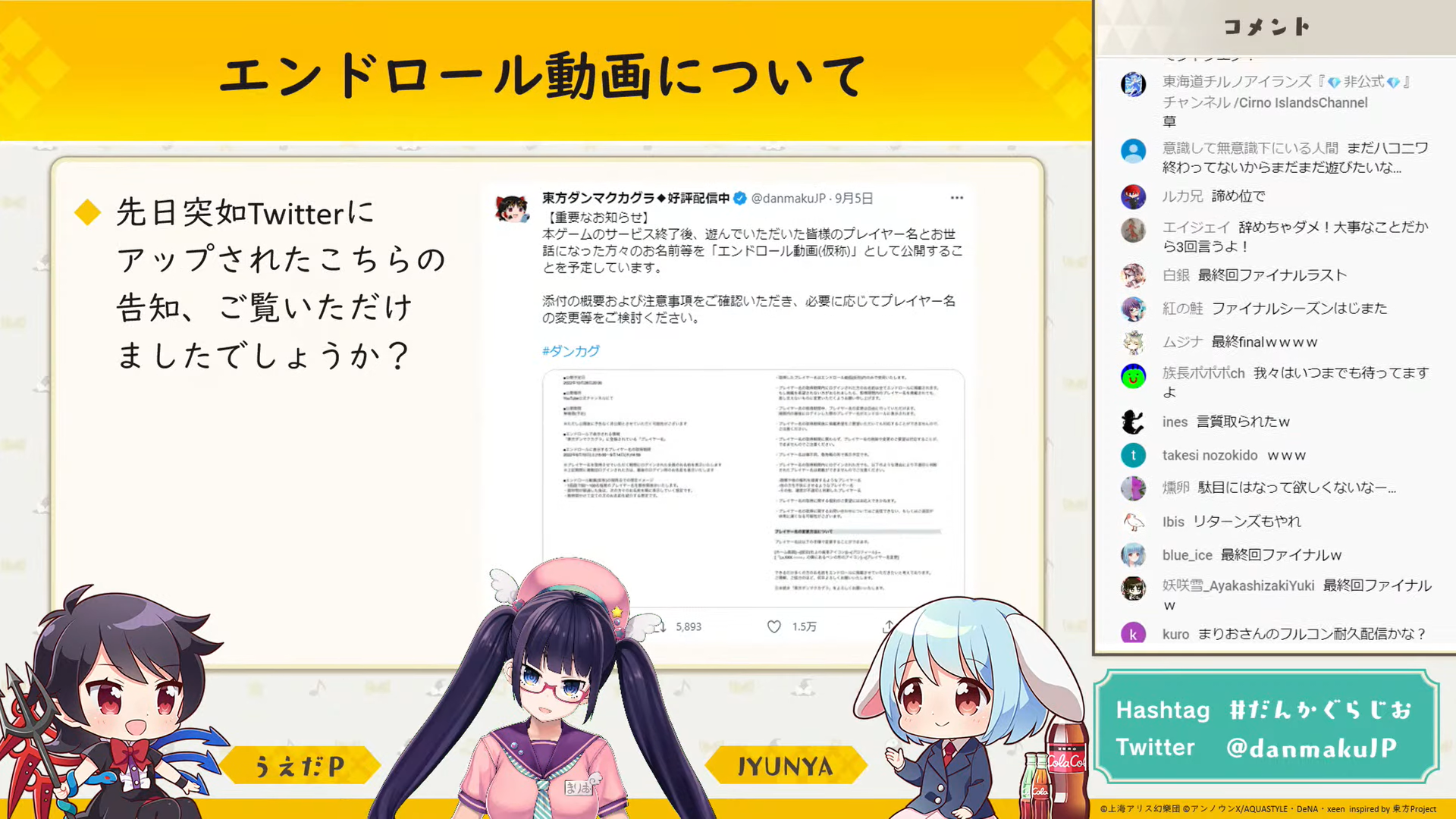 初回から追っている身としてはとても悲しく、お二人が東方について楽しそうに話していたり、興味深い裏話が聞けるのが好きで、実は毎回「ダンマク祭」より楽しみにしていました。