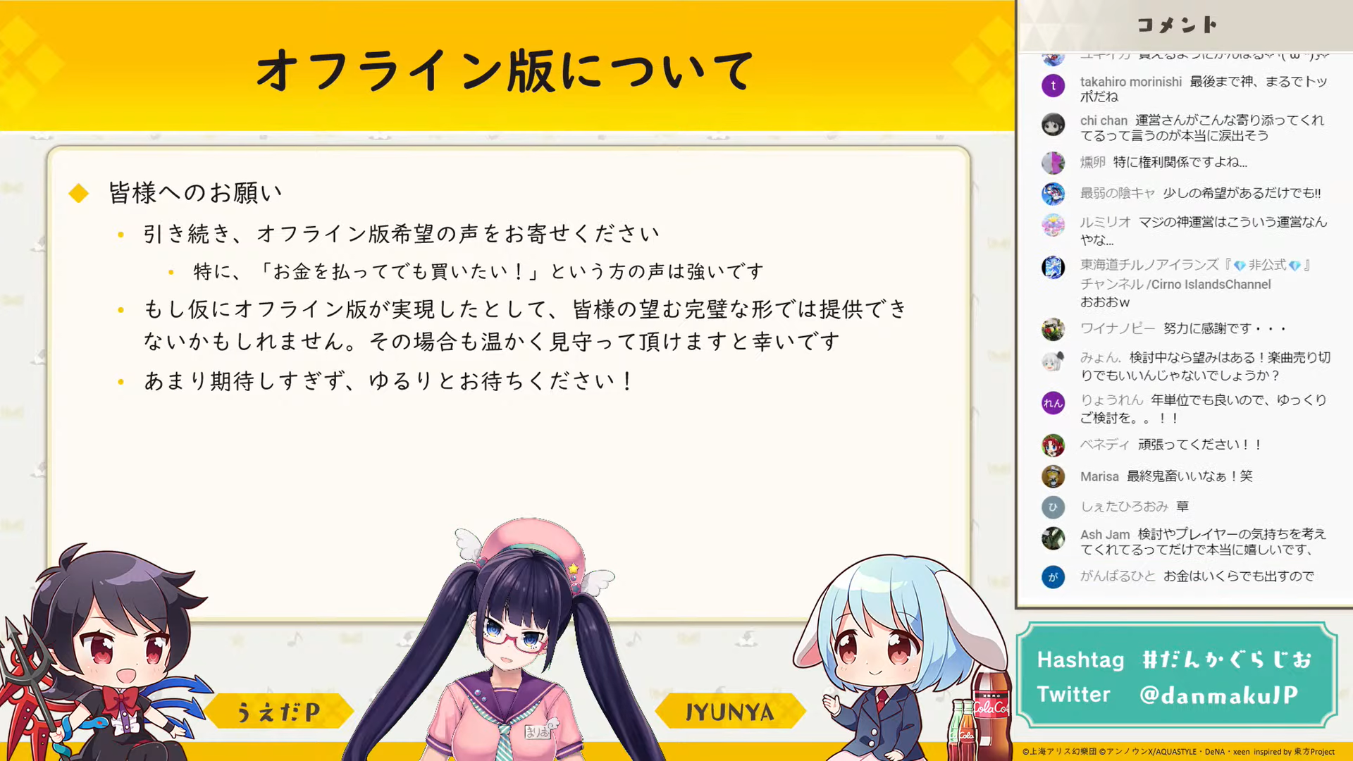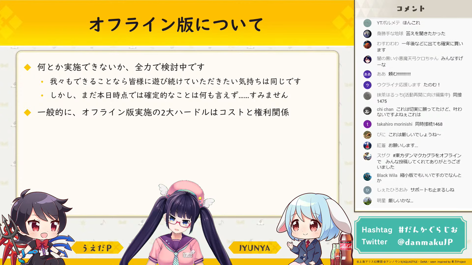 結論として、オフライン版の実施をアンノウンXは全力で検討していますが、コストと権利関係という大きなハードルもあるため現時点では確定的なことは何も言えないとのことです。