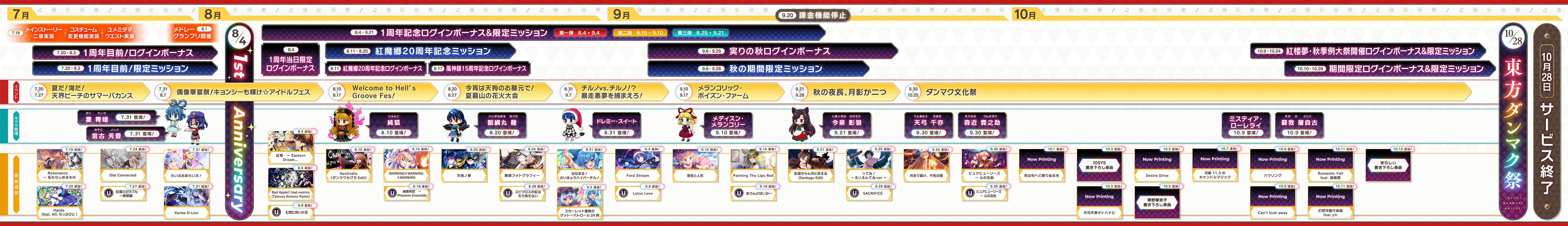 サービス終了時に発表されたロードマップでは、開発の都合もあって10月に実装予定の楽曲はジャケットイラストが公開されておらず、書き下ろしアレンジ楽曲については曲名すら未発表という状態でした。