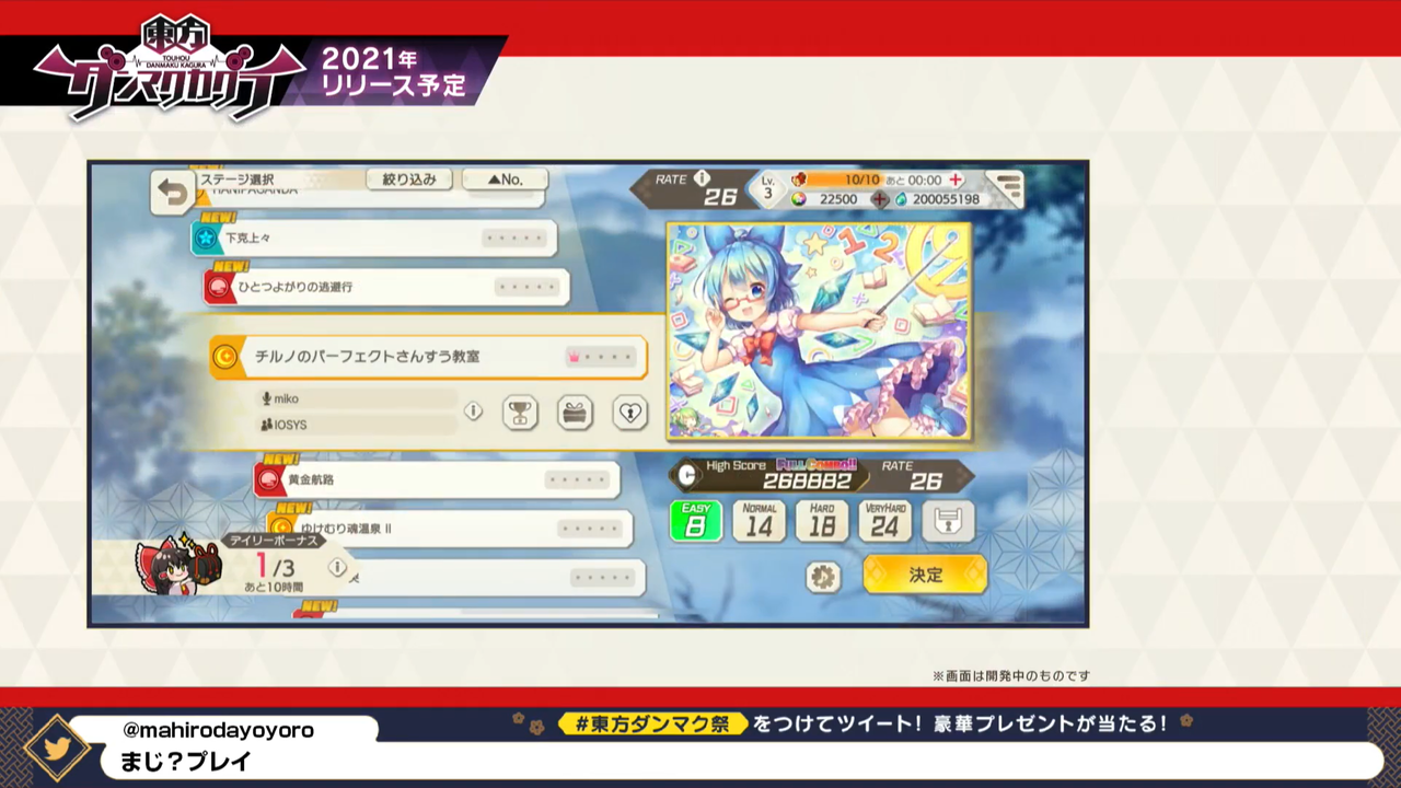 プレイした楽曲は「チルノのパーフェクトさんすう教室」で難易度はEASYです。