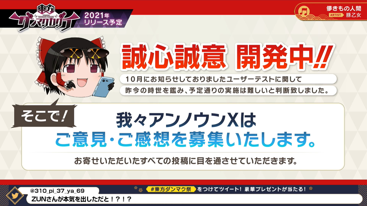 その代わり、アンノウンX(東方ダンマクカグラの運営)はゲームリリース前から意見や感想を募集するとのことなので、公開したゲーム映像や内容などに意見や感想のある方は下記のツイートに書かれている手順の通りに送ってあげましょう。