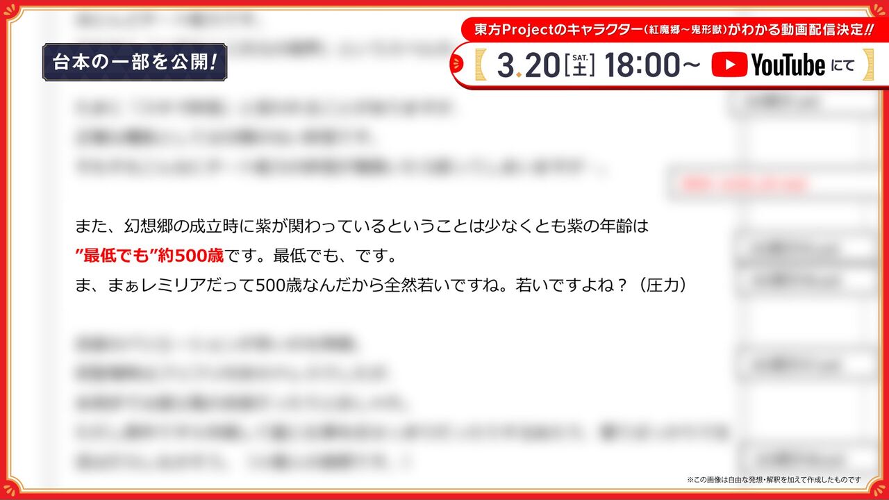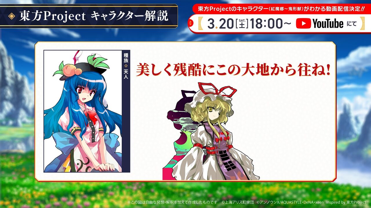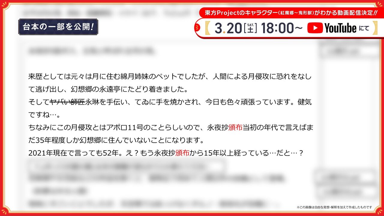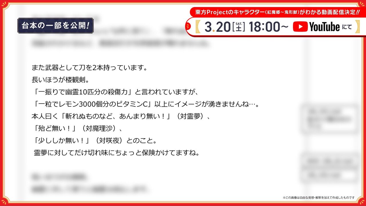 2021年3月20日(土)18時より放送が予定されている「【ゆっくりできない】東方Projectキャラクター大百科」ですが、放送前の段階から連日情報が公開されて盛り上がるなど期待が高まっています。