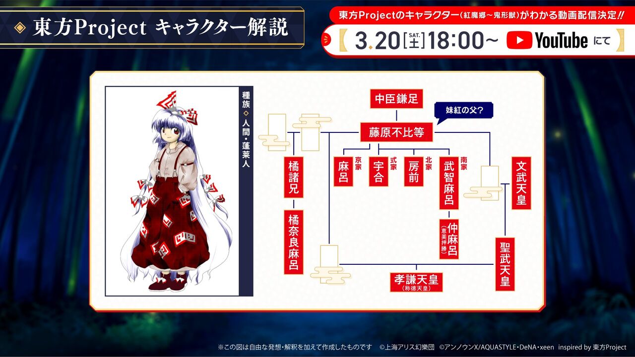 妹紅の父親である可能性が示唆されている藤原不比等を中心に、藤原氏の家系図についても取り扱うようです。