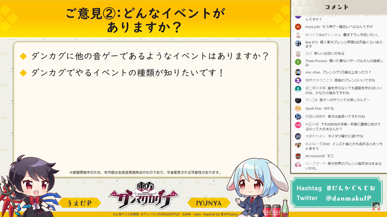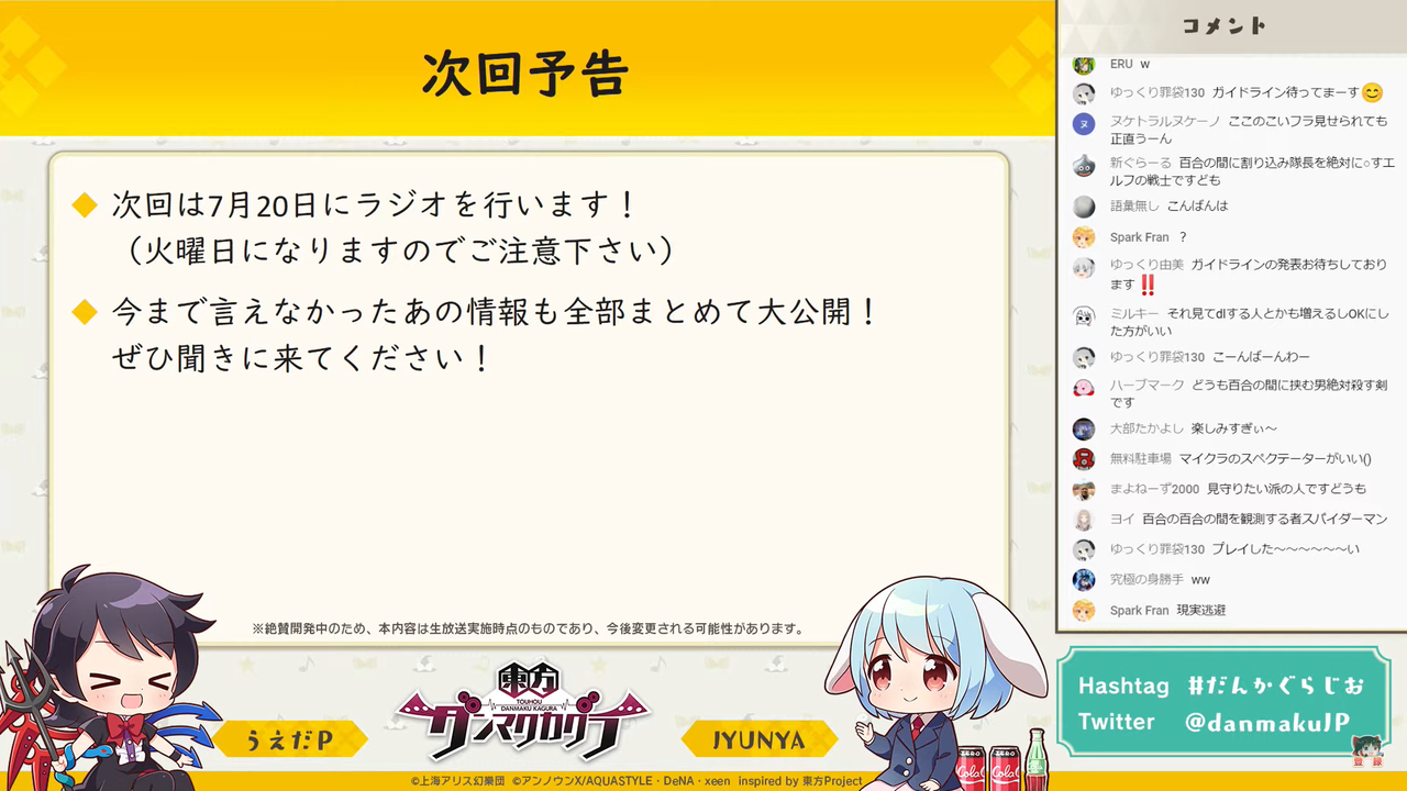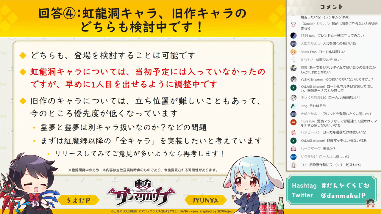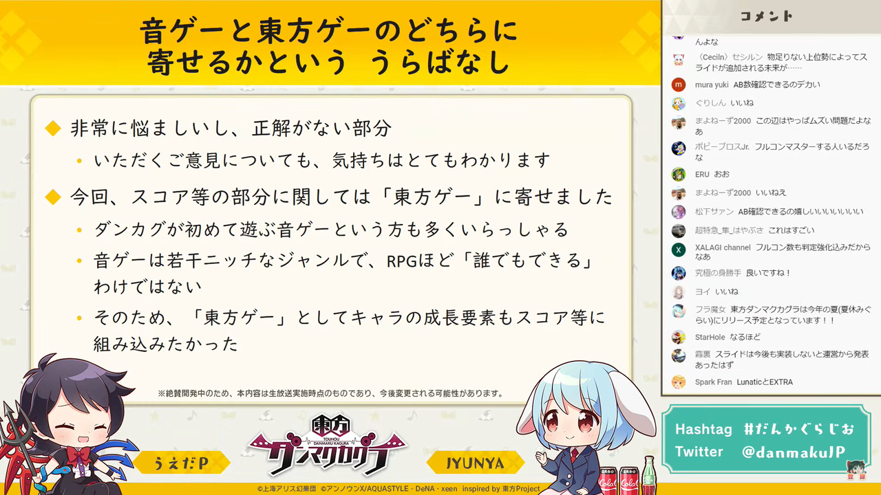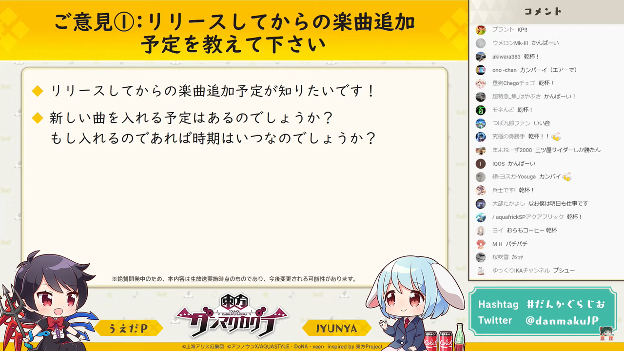主に「東方ダンマク祭 ダンカグライブSP」の振り返りを行った前回とは異なり、今回は以前よりの形式に戻って団長のJYUNYAさんと副長のうえだPさんがユーザーからの質問に答えつつ裏話などを話す放送となりました。