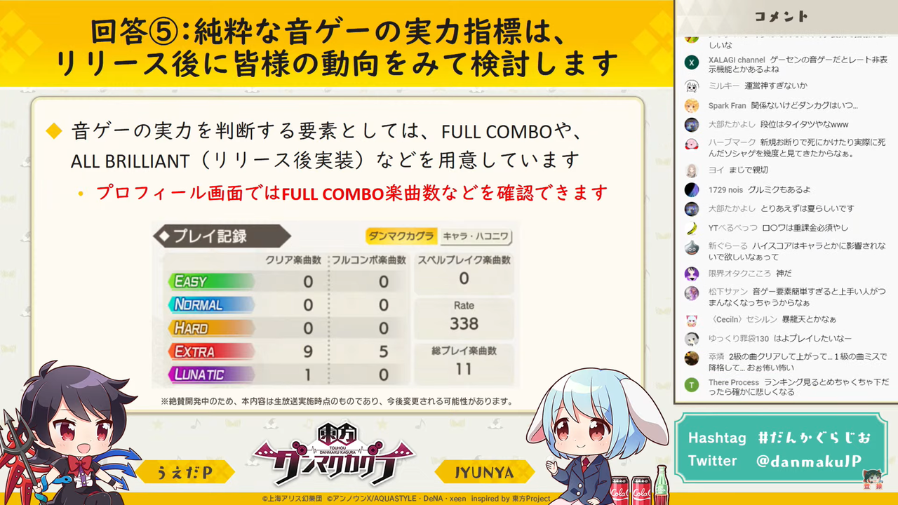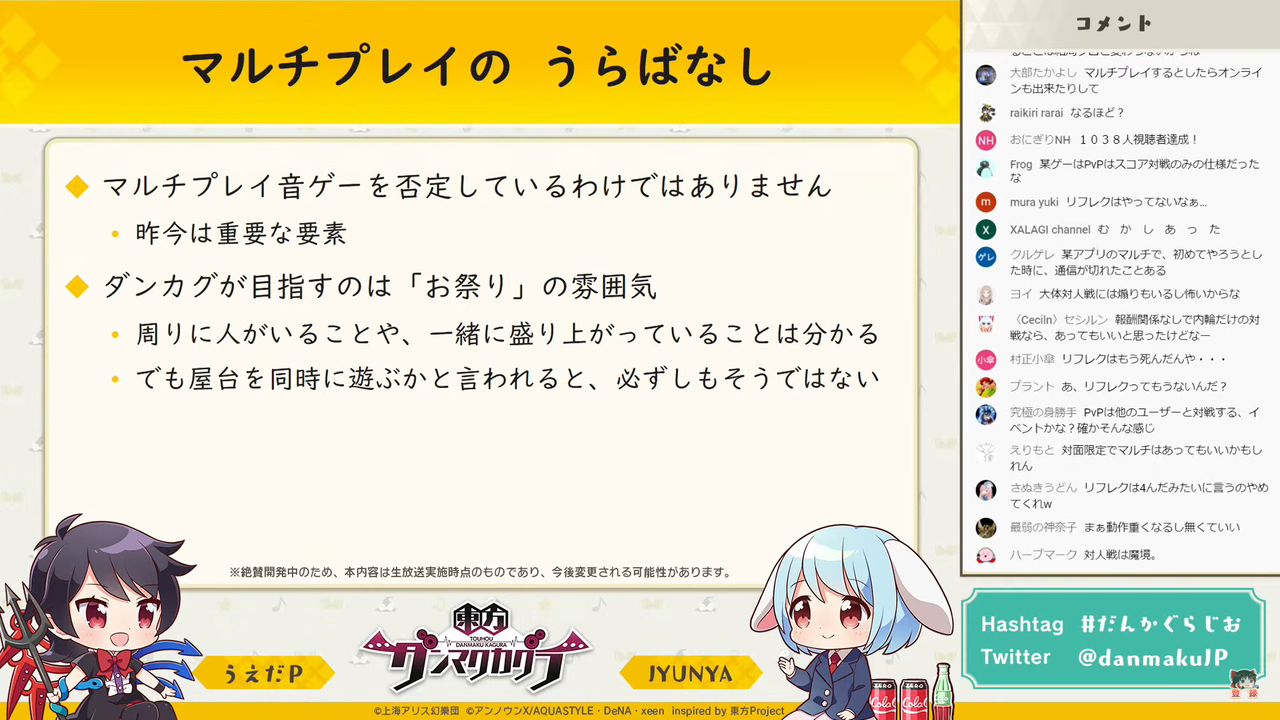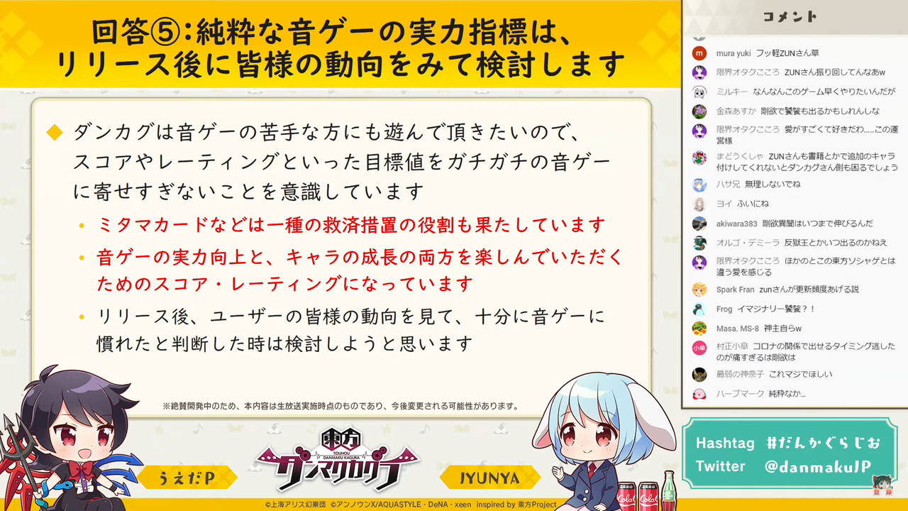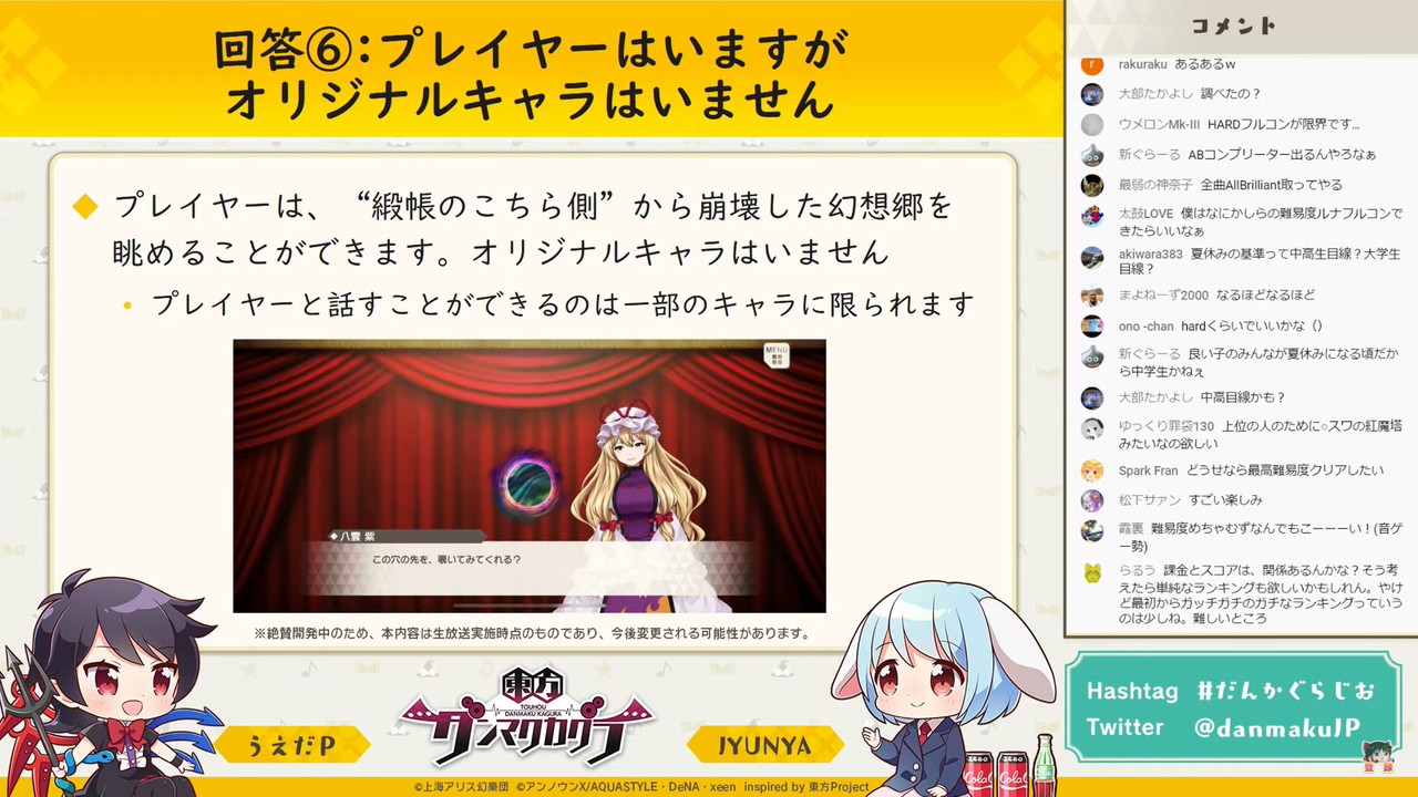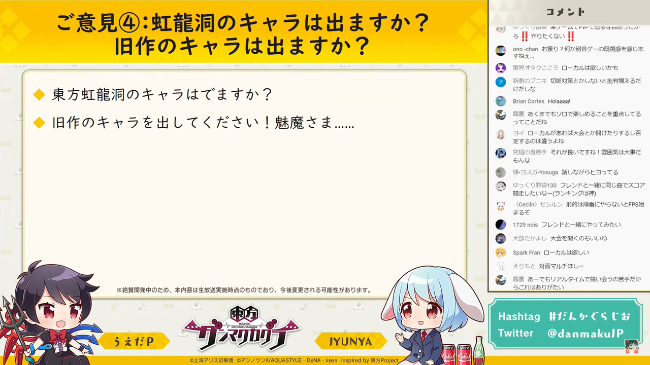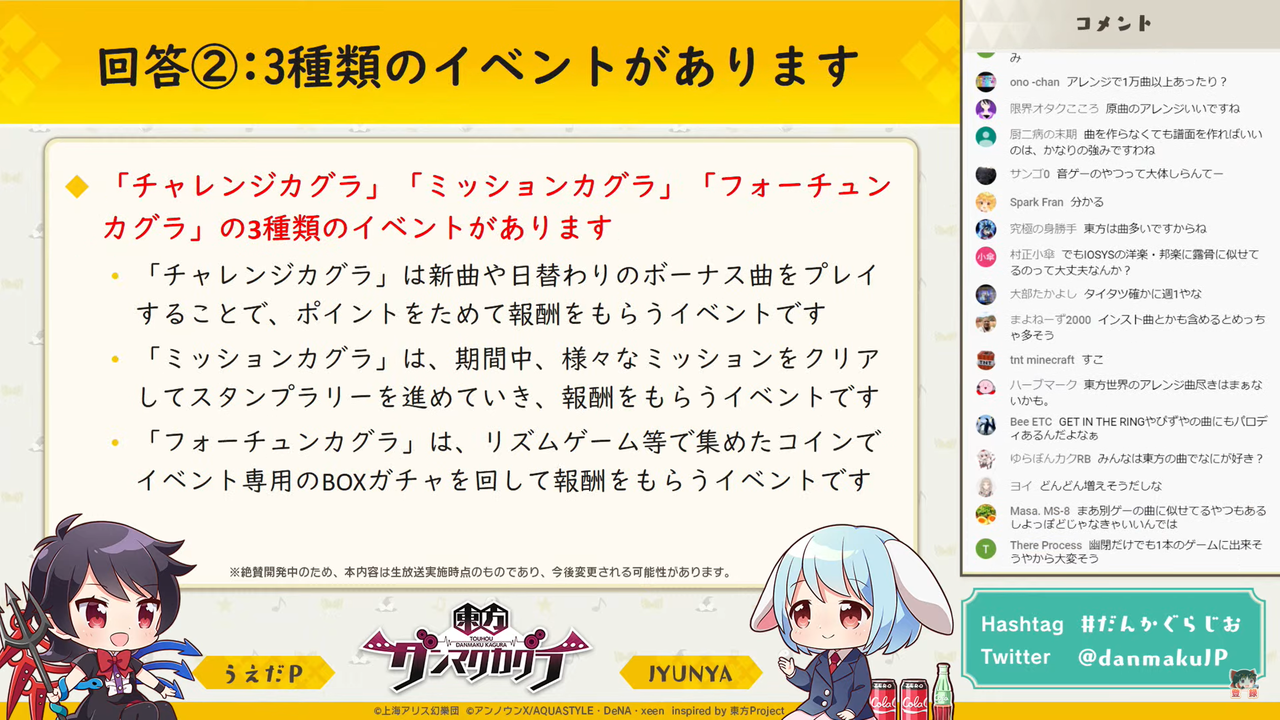 主に「東方ダンマク祭 ダンカグライブSP」の振り返りを行った前回とは異なり、今回は以前よりの形式に戻って団長のJYUNYAさんと副長のうえだPさんがユーザーからの質問に答えつつ裏話などを話す放送となりました。